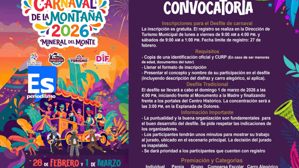 Colores, música, tradición en lo más alto de la montaña, es el slogan que acompaña a este tradicional carnaval que organizan la Secretaría de Turismo y el DIF Municipal de Mineral del Monte con el respaldo de la Presidencia Municipal.