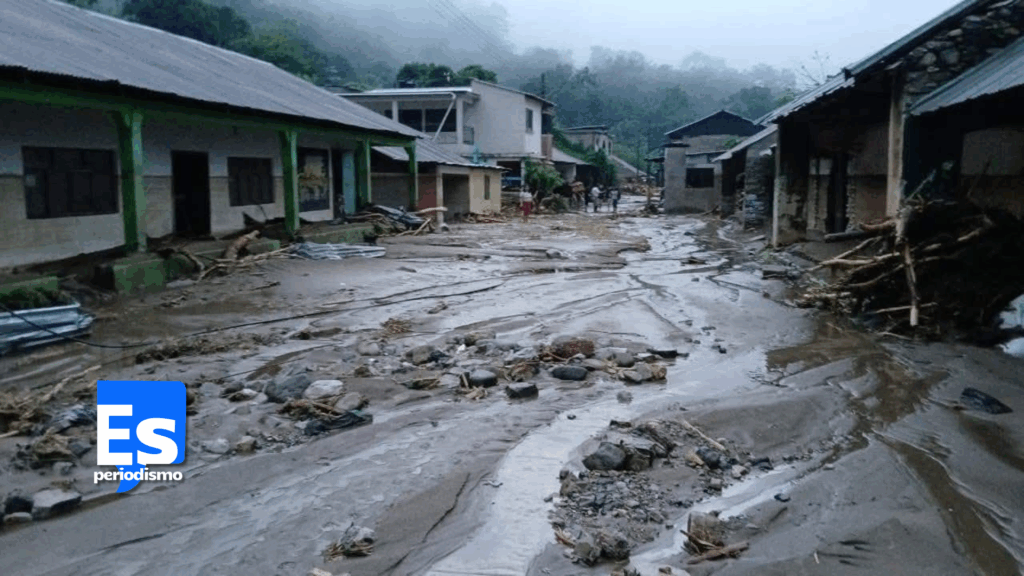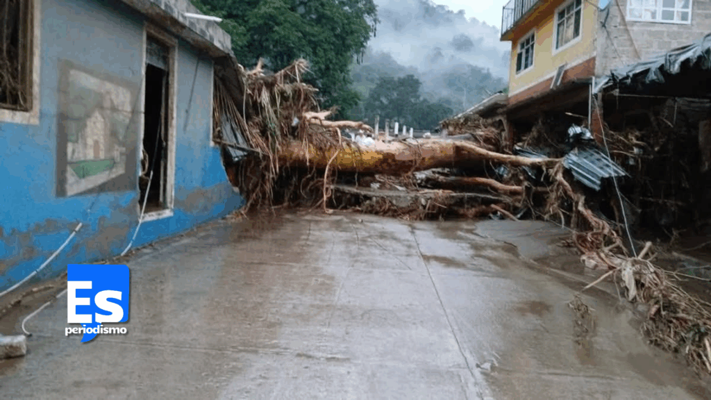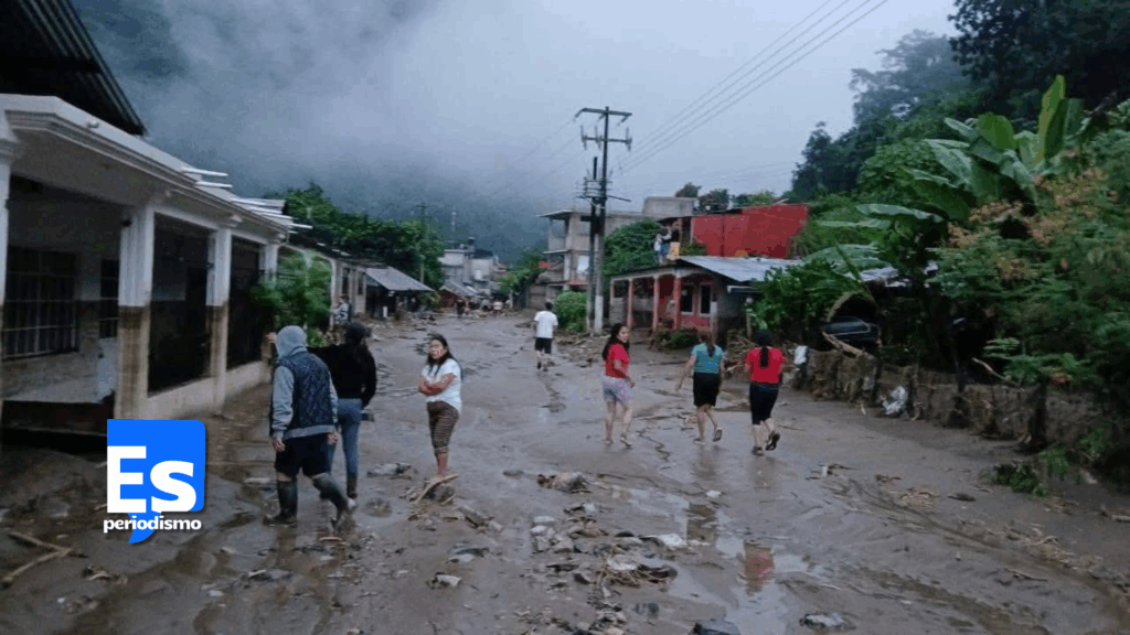 En Huehuetla, en la región otomí-tepehua, el río que atraviesa la cabecera municipal se desbordó, anegando gran parte del centro. El nivel del agua y lodos superó el metro de altura en varias viviendas.