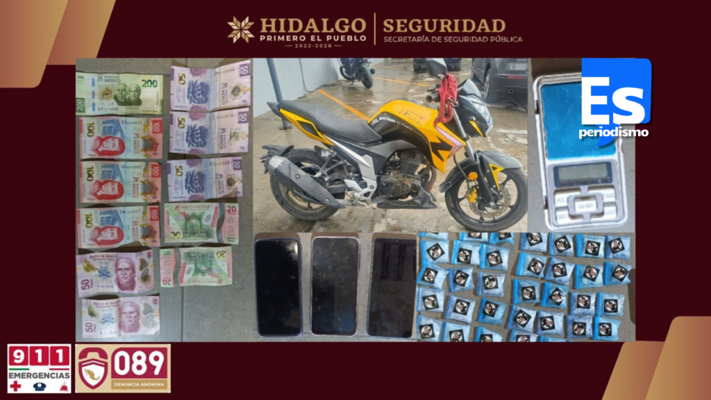 Los patrulleros le decomisaron 113 dosis de sustancia con características del cristal, una báscula gramera de precisión, tres equipos de telefonía celular, 790 pesos en efectivo y una motocicleta sin placas de circulación.