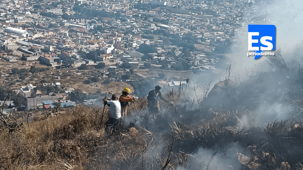 Protección Civil Municipal y Bomberos atendieron un fuerte incendio de pastizal, espinoso y vegetación arbustiva, registrado en el Cerro de la Cruz, ubicado en la colonia San Bartolo, de Pachuca.