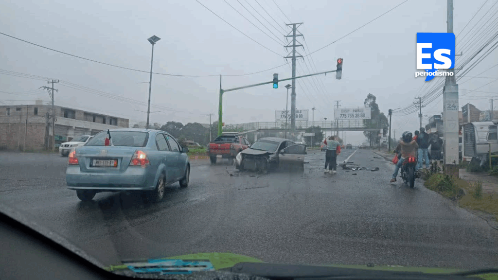 De acuerdo a testigos que circulaban por la zona durante pertinaz aguacero, el conductor del automóvil Cupra, color rojo, conducía presuntamente a exceso de velocidad cuando impactó de costado a un vehículo Versa, color gris.