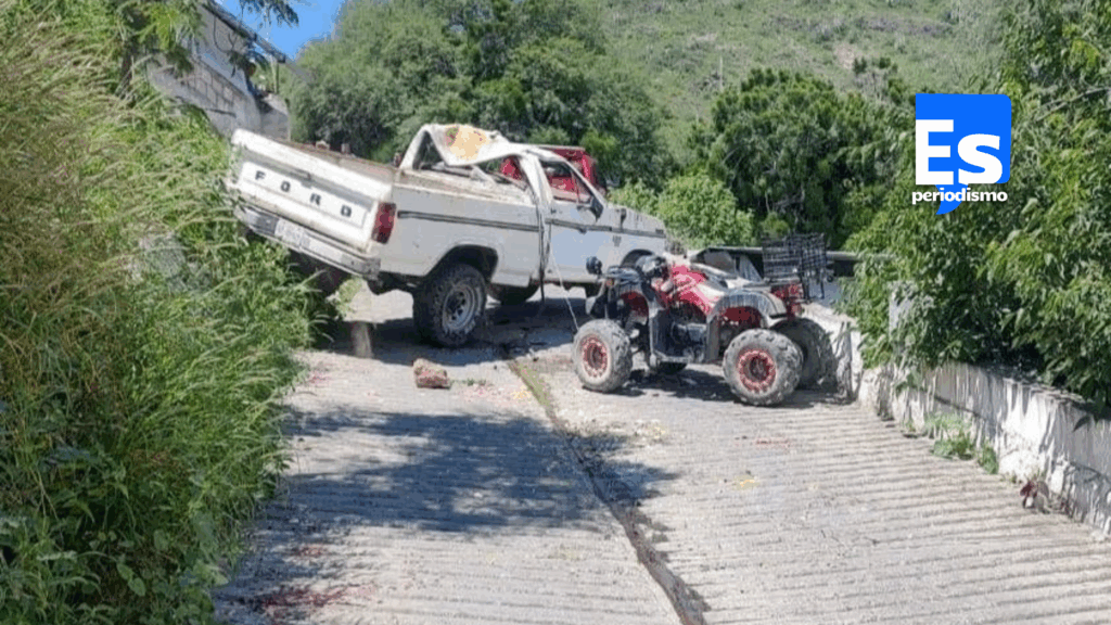 En este accidente la unidad tipo Ford Pick Up, color blanco, terminó completamente volcada, con las llantas hacia arriba, y aplastando a un cuatrimoto de color rojo.